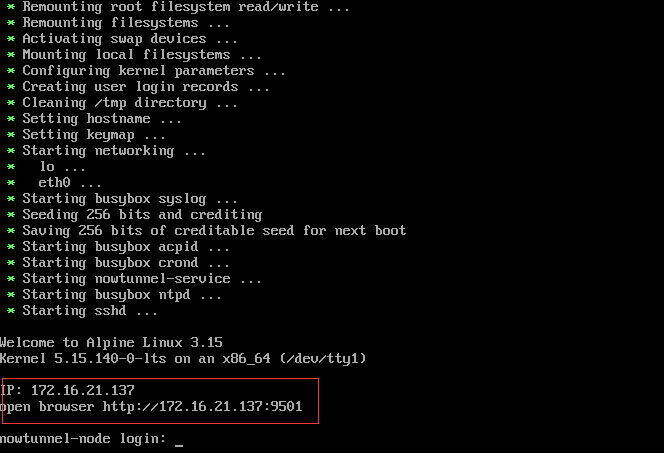 打开浏览器,使用上图自动获取到的IP访问管理控制台 http://172.16.21.137:9501 帐号:admin 密码:nowtunnel